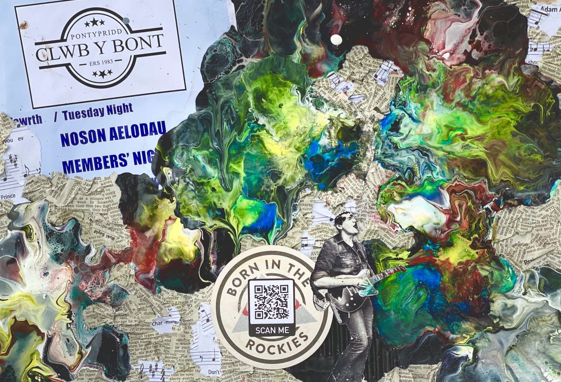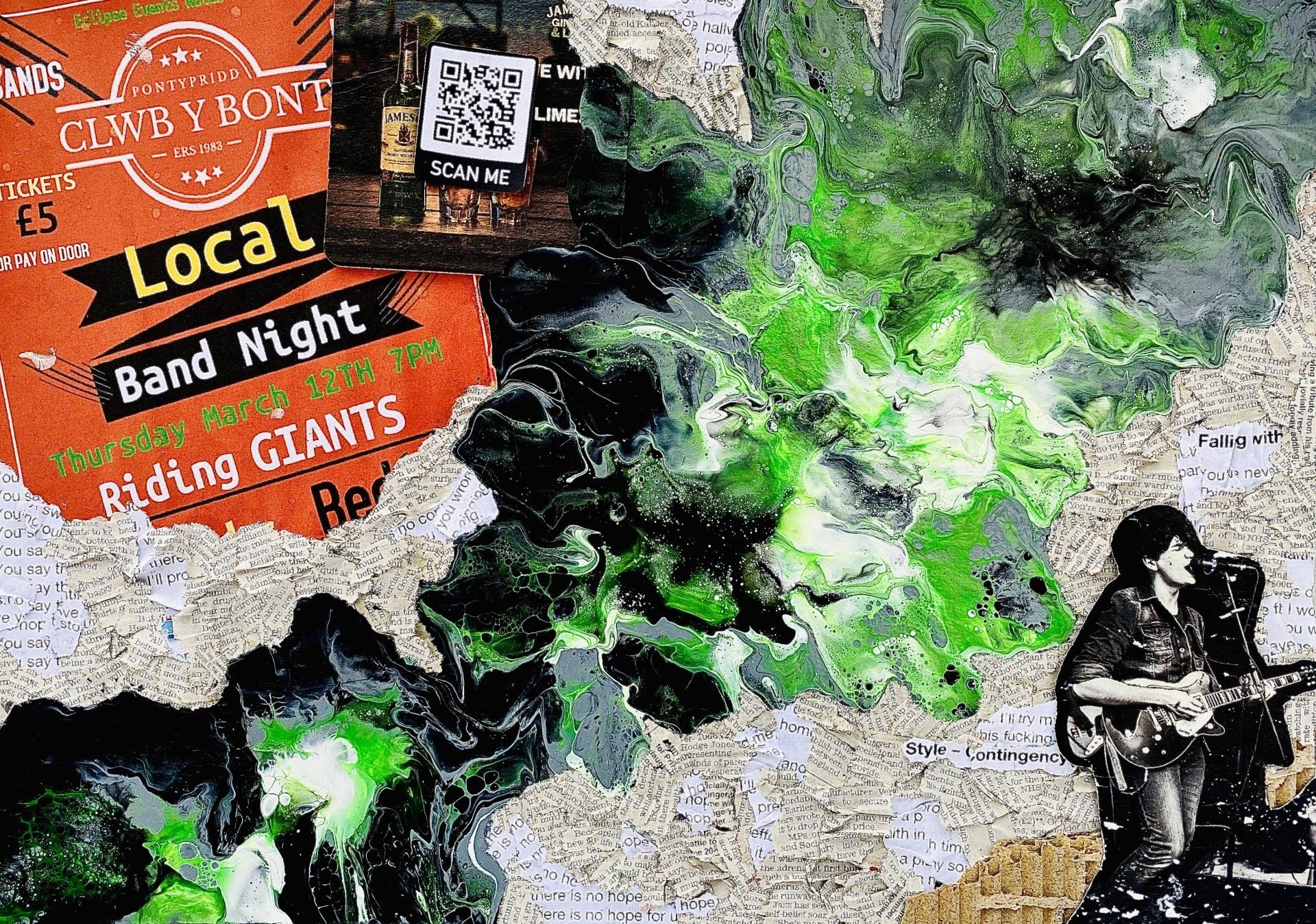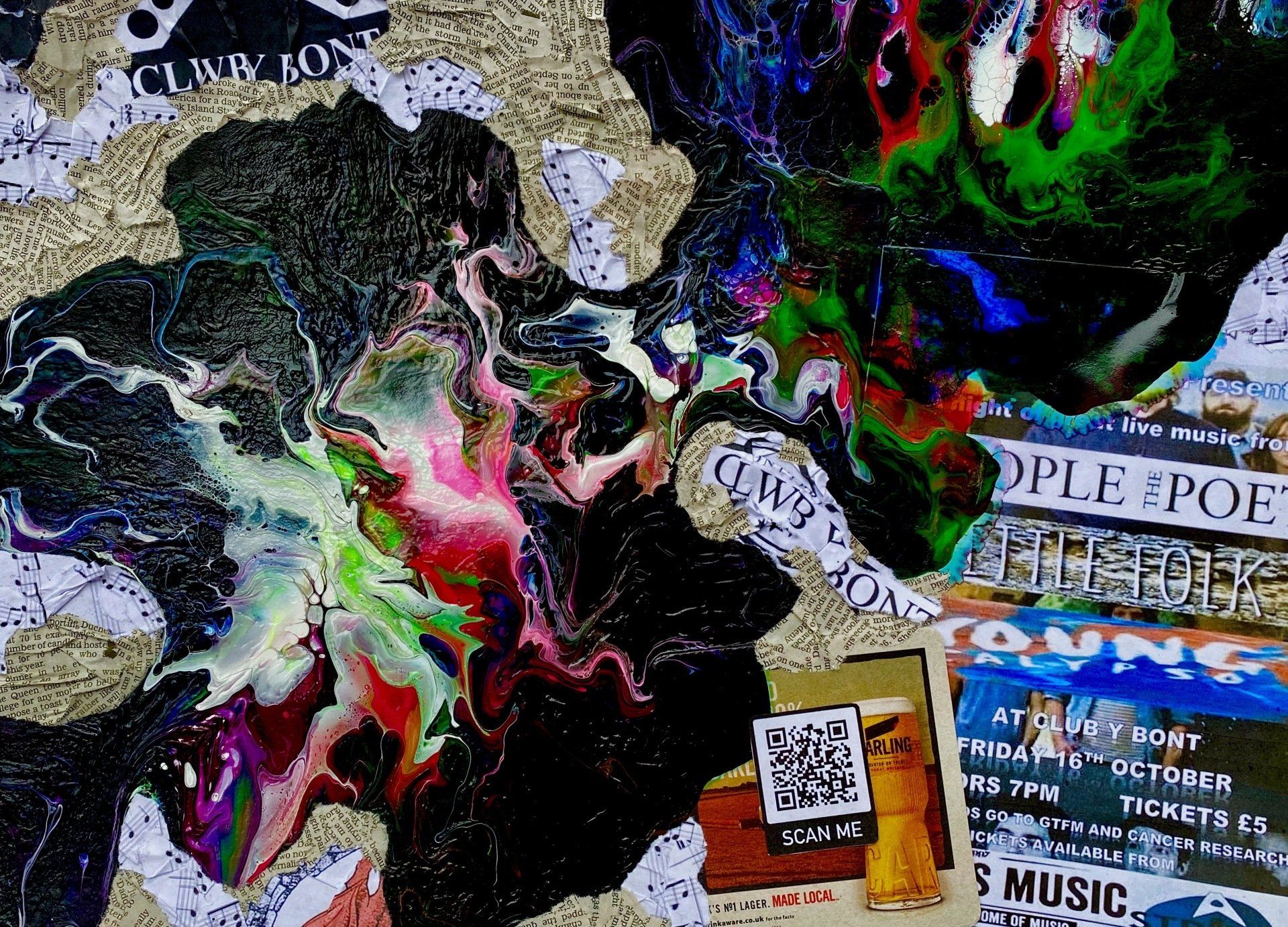 The artwork exhibited here has been inspired by responses to a call out where I asked the local people of Pontypridd Town, ‘What does Clwb y Bont mean to you?’. Every response focused on the live music performed at Clwb y Bont, and the opportunity for new and upcoming bands to play. Each consequent artwork produced is based on an individual’s response. I translated the specific music they have enjoyed at the venue into abstract, paint pour paintings. The unique qualities of the music have been represented through colour, these colours being those that I instinctively feel whilst listening to the songs. I embedded a range of materials such as beer mats, posters, newspaper, song lyrics and the Clwb y Bont logo into each painting to evoke the atmosphere and nature of Clwb y Bont. The beer mats and posters used were provided by the venue. Click on the link to hear an audio description of each painting read aloud by Terry Chinn from Clwb y Bont. Download a QR scanner app to your mobile phone or tablet and scan the QR code on the beer mat of each painting to hear the music track that inspired it.