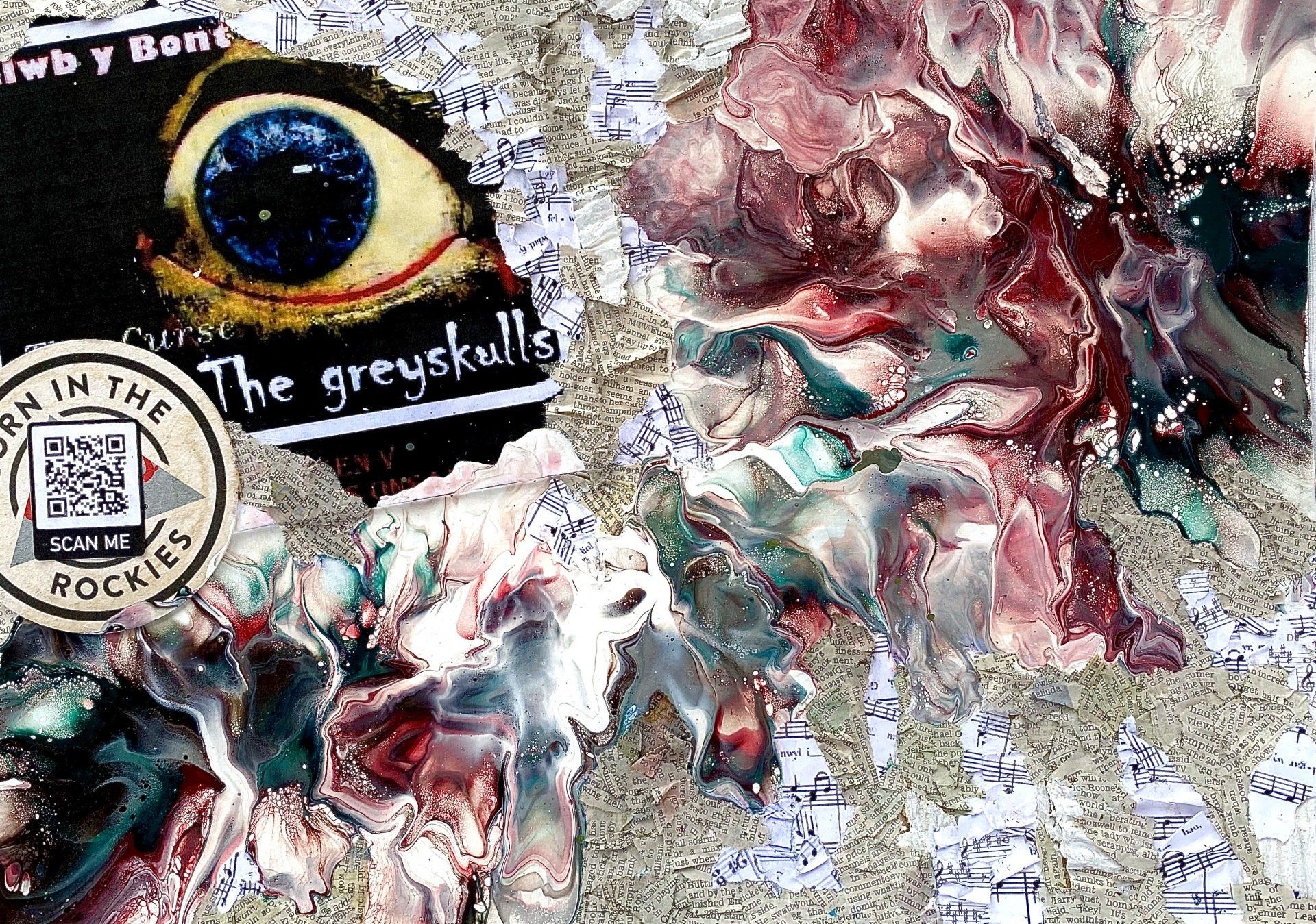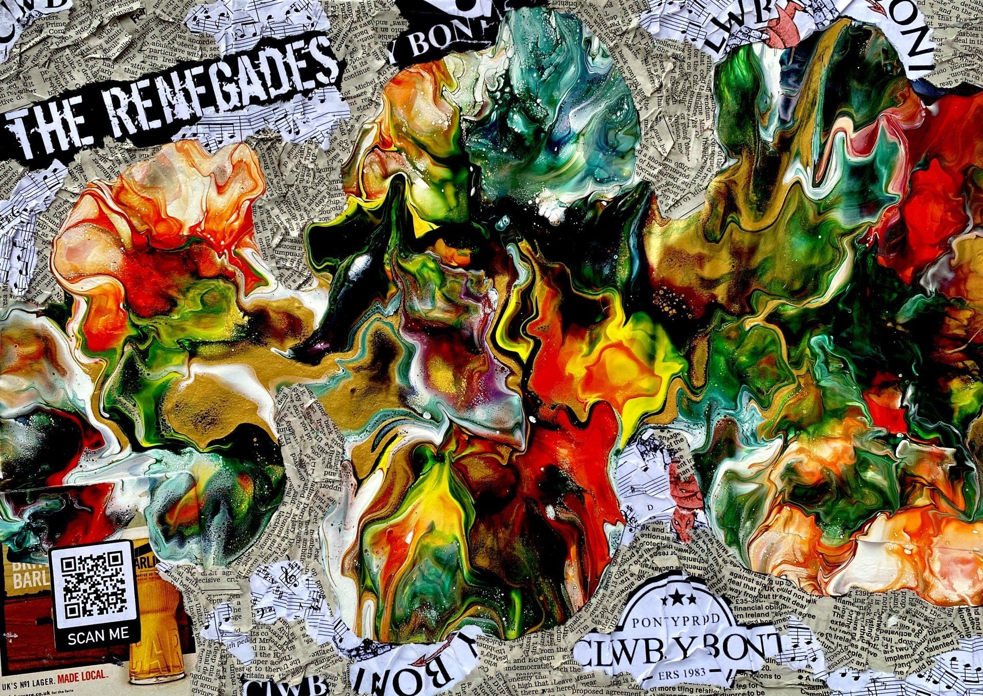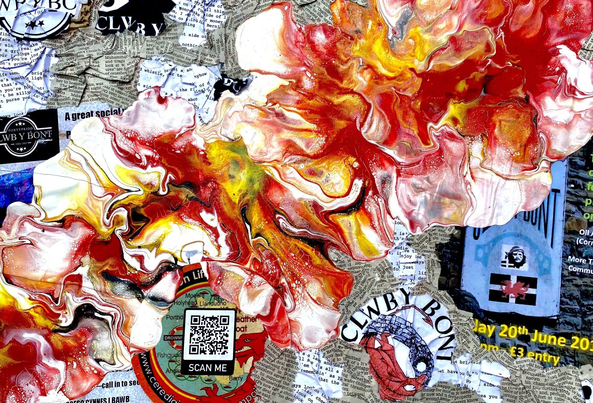 The artwork exhibited here has been inspired by responses to a call out where I asked the local people of Pontypridd Town, ‘What does Clwb y Bont mean to you?’. Every response focused on the live music performed at Clwb y Bont, and the opportunity for new and upcoming bands to play. Each consequent artwork produced is based on an individual’s response. I translated the specific music they have enjoyed at the venue into abstract, paint pour paintings. The unique qualities of the music have been represented through colour, these colours being those that I instinctively feel whilst listening to the songs. I embedded a range of materials such as beer mats, posters, newspaper, song lyrics and the Clwb y Bont logo into each painting to evoke the atmosphere and nature of Clwb y Bont. The beer mats and posters used were provided by the venue. Click on the link to hear an audio description of each painting read aloud by Terry Chinn from Clwb y Bont. Download a QR scanner app to your mobile phone or tablet and scan the QR code on the beer mat of each painting to hear the music track that inspired it.